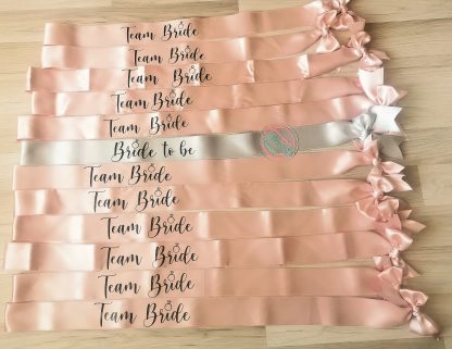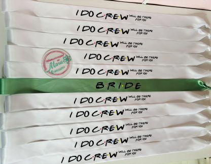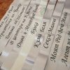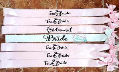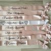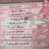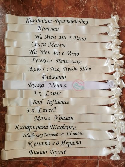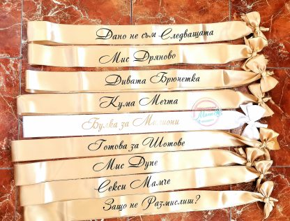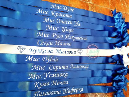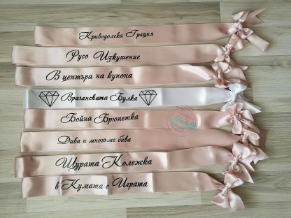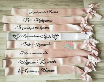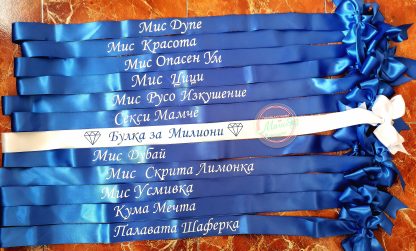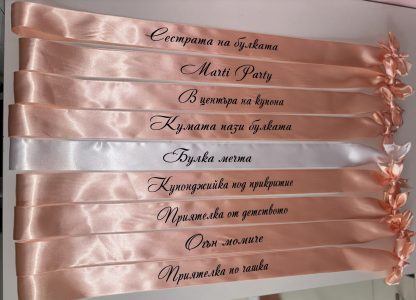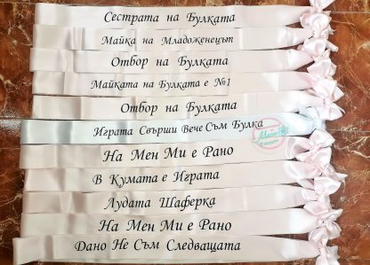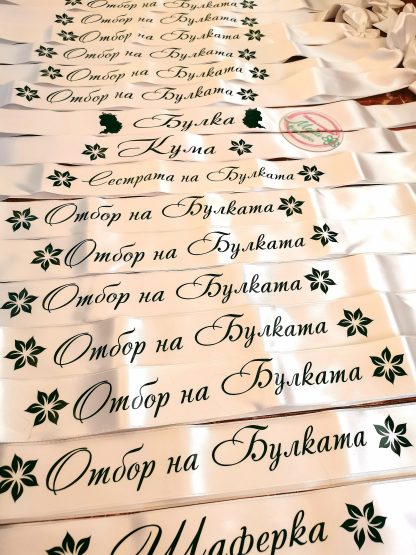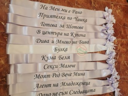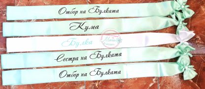 Лентите са изработени от мек сатен. Персонализирания надпис е по Ваше желание, както и цвета на лентата и буквите.