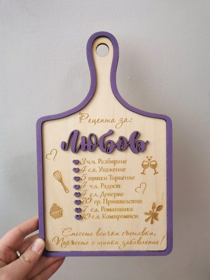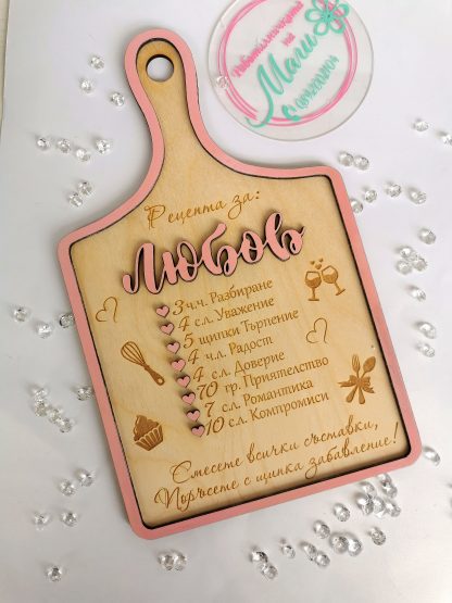 Гравирана дъска с нежно послание. Това е рецептата, която е най-ценна за един щастлив живот! Щипка любов, поднесена по необичаен начин. Смесете всички съставки, подарете емоция, настроение и огромна усмивка. Не ти е нужен повод, за да зарадваш любим човек, но Свети Валентин е още един ден, който е причина за приятни емоции.