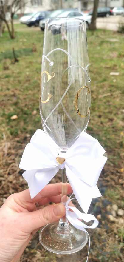 Шампанско и чаши за една специална двойка. Нека в живота Ви винаги има много поводи за наздравици и парад от безкрайни усмивки. Този кокетен комплект е създаден за един специален ден. Вашият ден! Чудесен завършек на празничната маса. Изненадайте младоженците с нещо красиво и създадено с финес. Може да се изработи по ваша идея. За най-специалните моменти, декорирано с любов.