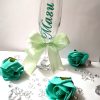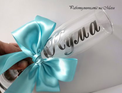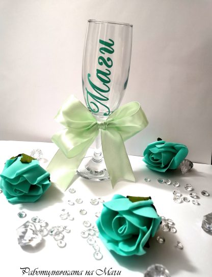 Стилни и качествени чаши за шампанско с височина 21 см и вместимост 210 мл. Ръчна декорация от екипа на Работилничката на Маги.