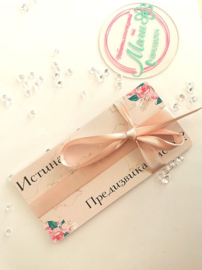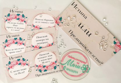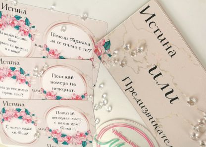 Поради големия интерес Ви представяме нашата нова и забавна игра за моминско парти! Различно предложение, което ще Ви залее със забавни моменти. Моминските партита трябва да бъдат запомнени! Превърнете тази нощ в нещо специално за булката и създайте спомени. С тази игра – скуката не съществува. За една луда вечер, изпълнена със забавления, весели игри и магия. Предизвикайте истински фурор, поднасяйки на бъдещата булка игра, която да даде началото на купона! Усмихнете се и не забравяйте, че веднъж се живее! 😍 Картата изтегли и написаното изпълни, нека всеки миг във вълшебство да превърнеш ТИ.